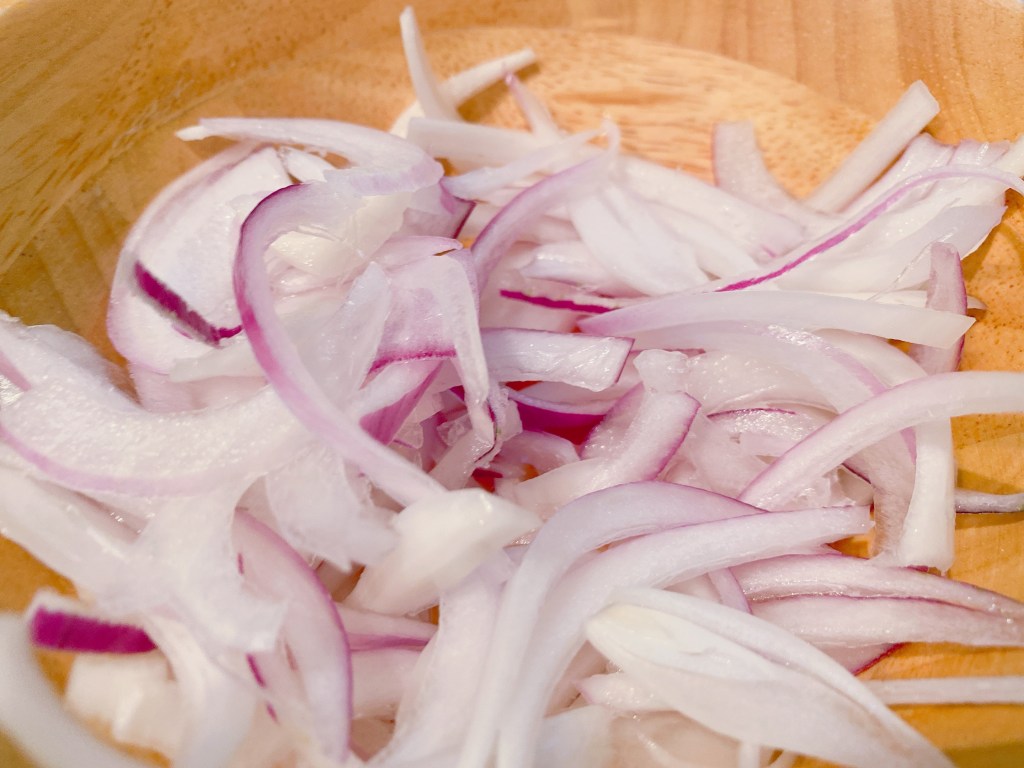 赤玉ねぎは水にさらしてサラダとしていただきました。